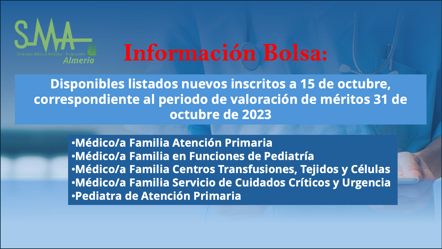 Desde hoy 3 de diciembre se podrán consultar las personas inscritas en la Bolsa de empleo a 15 de octubre de 2025 que figuran en el Anexo I del listado de nuevos inscritos de las categorías correspondientes publicado en la Web del SAS (dentro de los listados Definitivos de Personas candidatas de cada categoría).